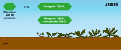 Ekonomiczna sekwencja zabiegów to: zabieg posiewny herbicydem zawierającym chlomazon w formulacji 480 EC i następnie Navigator™ 360 SL 0,2 l/ha powschodowo. Mieszanina oraz sekwencja zapewniają oczekiwaną przez rolników wysoką skuteczność i długotrwały efekt chwastobójczy. W trakcie aplikacji powschodowych chwasty powinny znajdować się w fazie do 2 liści właściwych.